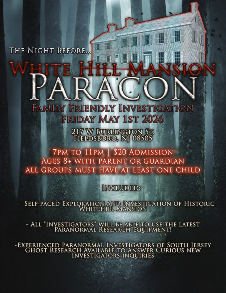Kids will enjoy self-paced investigation of the Haunted Historic White Hill Mansion accompanied by their parent or guardian. All budding investigators will have access to the latest paranormal research equipment to learn and explore the unknown while also having experienced investigators from South Jersey Ghost Research available to answer any questions!